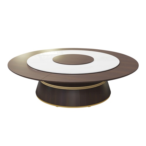 产品材质:电动餐桌的台面是由实木+岩板转盘组成,桌脚围板是纤维板材和钛合金饰片装饰。可定做